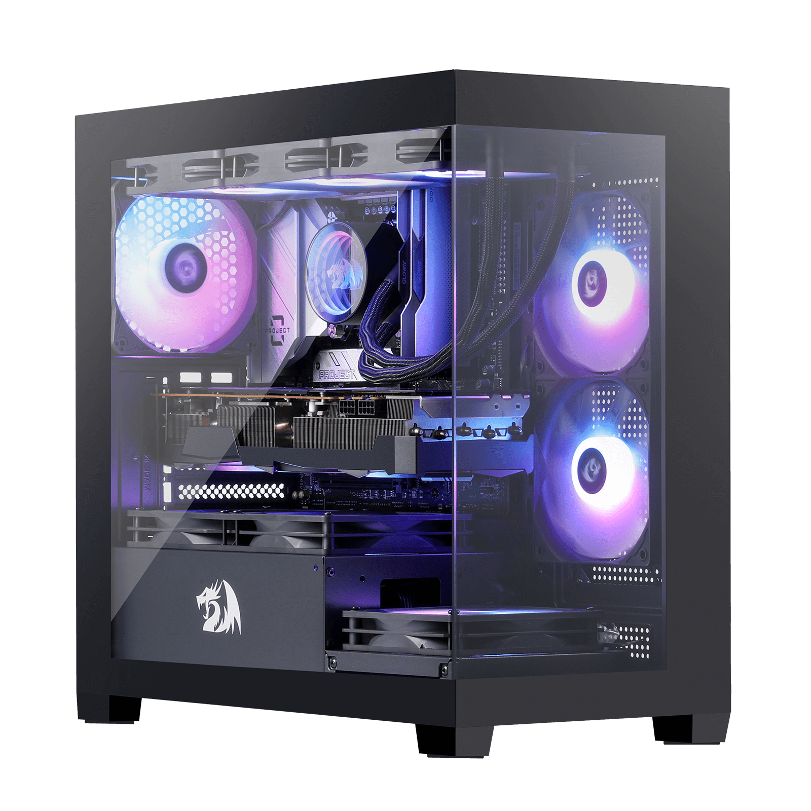 The 270° panoramic case offers a stunning view of your gaming rig through fully tempered glass panels. Diamond-cut angles elevate your setup. delivering a striking visual experience for every gamer.