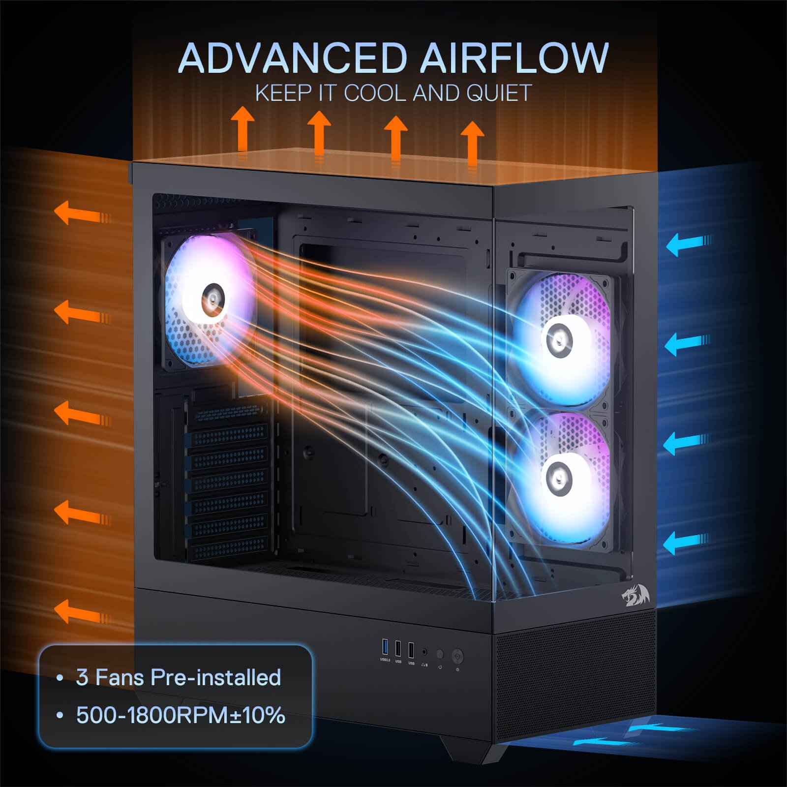This mid-tower PC case features a sleek rectangular shape that conserves desktop space while looking elegant. With two translucent tempered glass panels. it lets natural light enhance your setup. The durable glass is resistant to damage and provides great sound insulation. ensuring a comfortable work and gaming environment.
